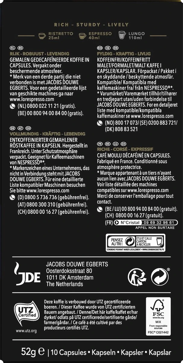 L’OR Espresso Ristretto Decaffeinato – Intensiteit 9/12 – 10 X 10 Capsules