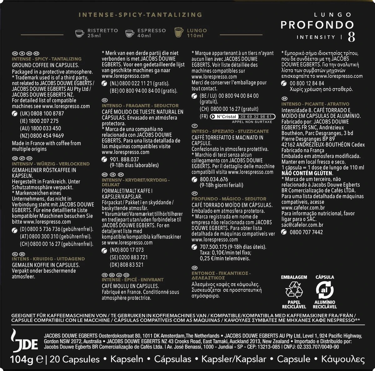 Lungo Profondo overtuigt je met zijn intens en kruidig aroma van geroosterde amandelen en uitdagend zoethout, afgerond met een glinsterende bronzen crèmelaag.